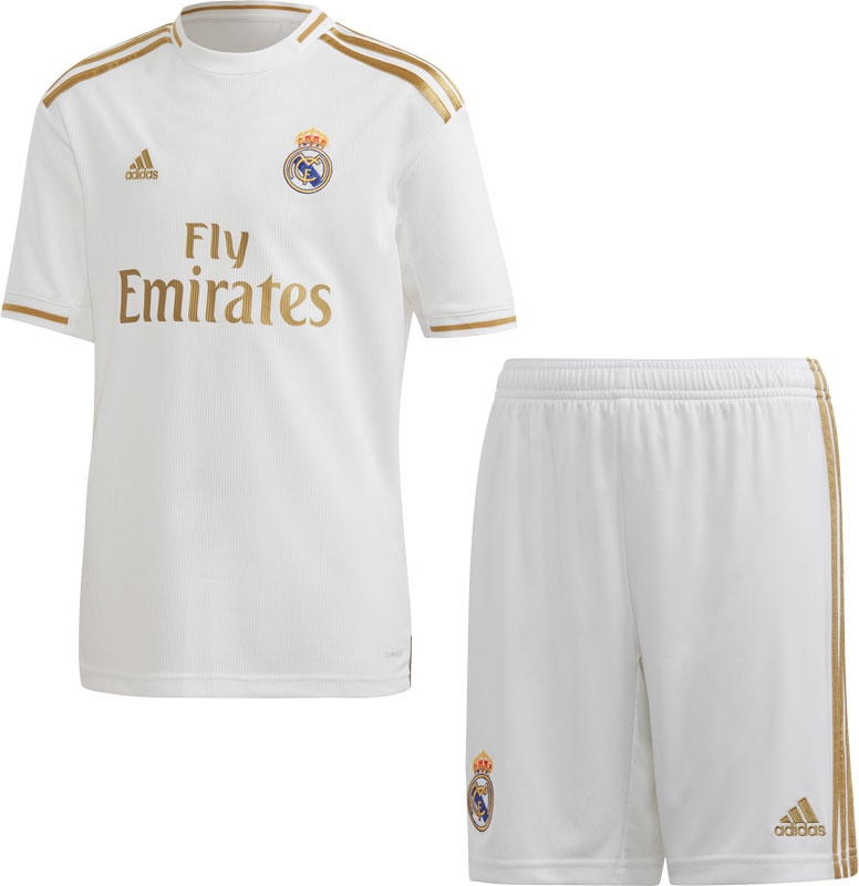 – Het adidas Real Madrid Thuis Tenue is afkomstig uit de officiële collectie van ?De Koninklijke? voor het seizoen 2019/2020. De sterspelers van Real Madrid zullen in dit strakke design te bewonderen zijn tijdens thuiswedstrijden in de Primera División. Dit tenue is speciaal ontworpen voor jonge fans van Real Madrid en bestaat uit een shirt, short en sokken. Het lichtgewicht stretchmateriaal zorgt voor uitstekende zweetafvoering en bevat mesh panelen voor extra ventilatie. De kleding is afgewerkt met de kenmerkende adidas stripes en het clubembleem van Real Madrid. De verwerkte ClimaCool technologie is een combinatie van prestatie stoffen, open mesh en ventilatiekanalen die koele lucht de kleding in laat stromen, en warmte en zweet naar buiten. Hierdoor blijf je droog, comfortabel en presterend op je top in de meest verhitte wedstrijden. Materiaal: 100% gerecycled polyester